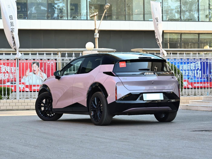 再来看车身侧面部分,车身侧面是极氪 X 的 “空间魔术” 所在:4450mm 的车长搭配短前后悬设计,让 2750mm 轴距的优势最大化释放。五辐花瓣式轮毂延续现款经典造型,黑色涂装与车身双色设计形成呼应,动感十足。隐藏式电动门把手在解锁时自动弹出,不仅降低了风阻系数,更强化了科技感,1836mm 的车宽则为车内横向空间提供了保障。值得一提的是,虽然定位紧凑型 SUV,但极氪 X 的门洞高度与门槛设计经过优化,老人孩子上下车无需过度弯腰,狭窄停车场开门时也能避免碰撞邻车,兼顾了运动姿态与实用场景。